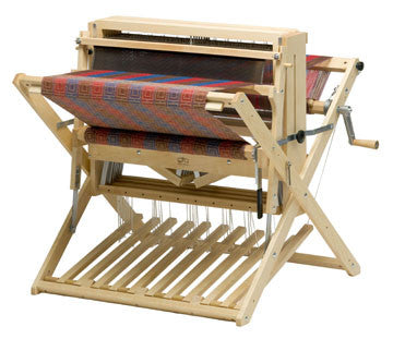 The weaving width of the Baby Wolf is 26". You have your choice of four or eight shafts, or you can choose our Four Now-Four Later* model which allows you to expand from four shafts to eight shafts at any time. The X-frame design is exceptionally stable and can be easily folded to a depth of 18". The loom comes with your choice of reed size (10 dpi is recommended), 400 heddles for 4 shaft and 800 heddles for 8 shaft. You can switch to texsolv for an added cost.